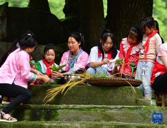 6月2日,在广西融水苗族自治县杆洞乡党鸠村,青年团员和小学生学习包粽子。