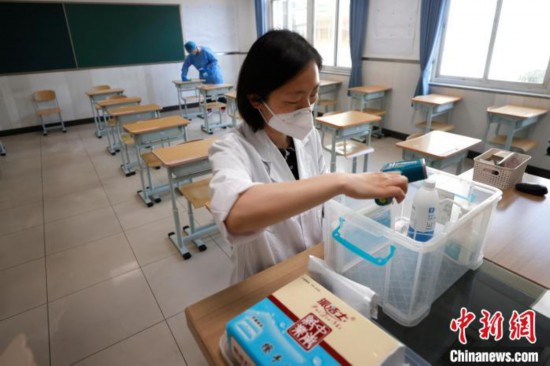 图为北京市东直门中学高考考点,负责防疫的老师在考场整理防疫用品。 中新社记者 富田 摄