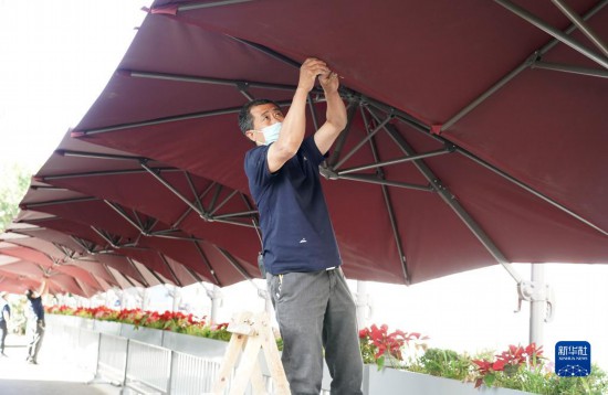 6月5日,在中国农业大学附属中学考点,工作人员架设防雨棚。