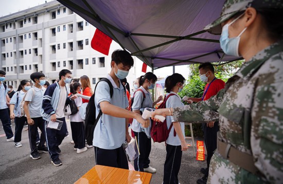 防城港市上思县考生排队进行体温监测后进入考场。上思县融媒体中心供图
