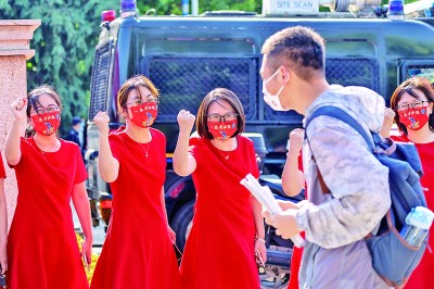6月7日,在江苏省南京市雨花台中学考点,送考老师为考生加油鼓劲。新华社发(杜懿/摄)