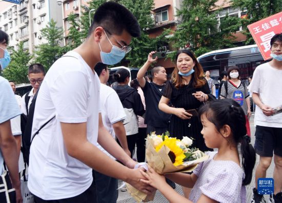 6月8日,在四川南充十中考点外,一名小朋友给考完试的哥哥献花。
