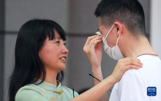 6月8日,在陕西省西安市西电中学考点外,家长为结束高考的考生安抚情绪。