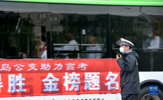 6月8日,在河北省秦皇岛市第三中学考点,交警在维护交通秩序。