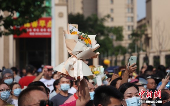 6月9日,江苏省南通市2022年普通高校招生全国统一考试南通大学附属中学考点外,一名考生亲友手举鲜花。 中新社发 徐培钦 摄 图片来源:CNSphoto