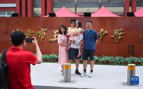 6月10日,在北京市玉渊潭中学考点门口,一名考生和家人合影。