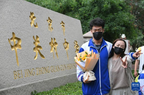 6月10日,在北京市中关村中学考点外,考生在考试结束后与家长合影留念。