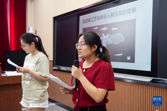 6月10日,东北林业大学外国语学院的学生在教室中用英语讲述赫哲族鱼皮画工艺和传承人的故事。