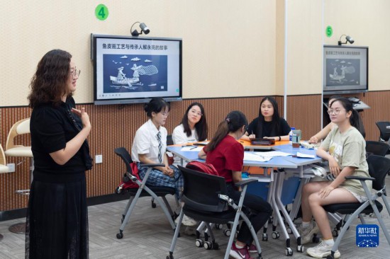 6月10日,在东北林业大学的教室中,熊辉(左一)和学生进行非遗对外翻译主题的分享讨论。