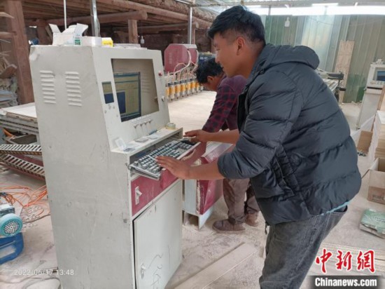 图为加永四郎正在木材加工厂操作电脑雕刻机。 洛松公秋 摄