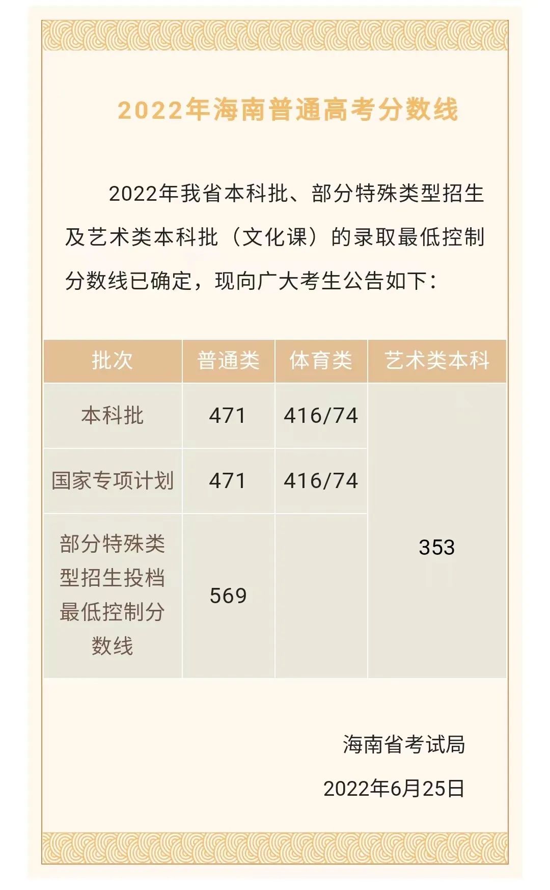 2022年海南省普通高考本科各批次录取最低控制分数线