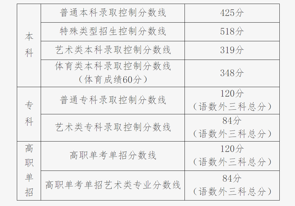 普通专科录取控制分数线120分(语数外三科总分),艺术类专科录取控制分数线84分(语数外三科总分),高职单考单招分数线120分(语数外三科总分),高职单考单招艺术类专业分数线84分(语数外三科总分)。