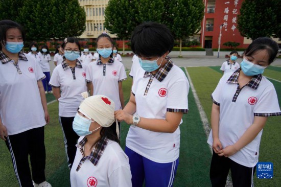 6月30日,河北省遵化市第三中学的学生在练习急救包扎技能。