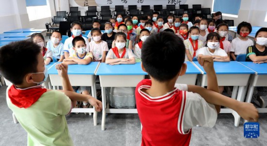 6月30日,在江苏省苏州市胥江中心小学校,两名学生在学习游泳热身操。