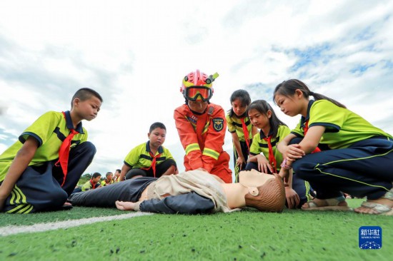 6月30日,在贵州省黔东南苗族侗族自治州岑巩县第三小学,消防员在传授心肺复苏技能。