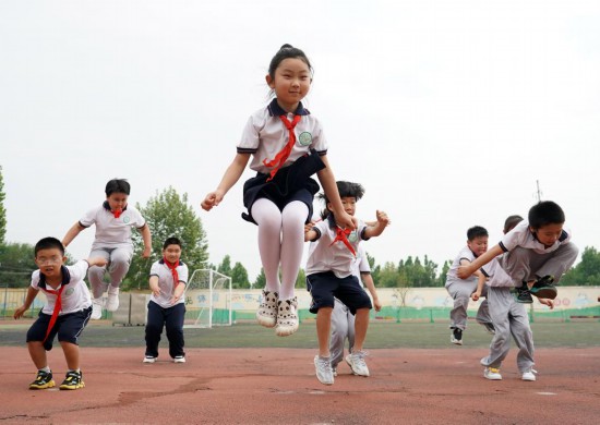 6月27日,在北京第二实验小学平谷分校,二年级(2)班的学生上体育课。新华社记者任超摄