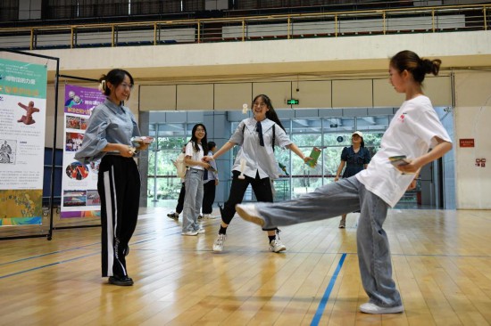 5月23日,在四川大学江安校区体育馆,学生在体验传统体育项目踢毽子。新华社记者胥冰洁摄