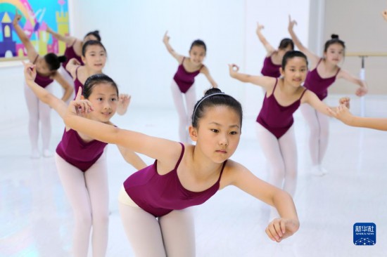 7月12日,山东省东营市东营区文汇街道一舞蹈培训学校教室里,学生在练习舞蹈动作。