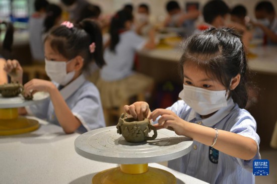 7月11日,河北省石家庄市柏林庄学校暑假托管班的小学生做陶艺。