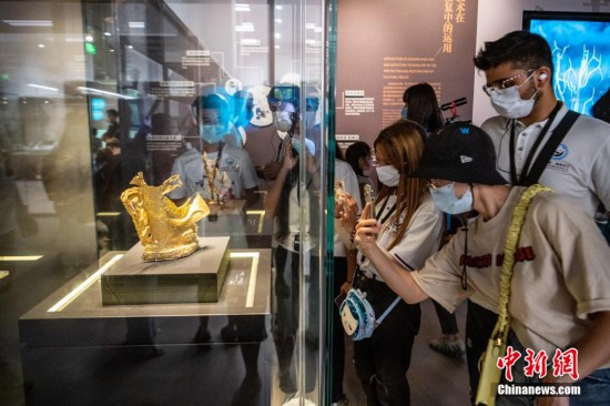 7月14日,“文化中国·锦绣四川——高校外籍师生巴蜀文化品悟之旅”活动走进四川德阳市绵竹年画村、广汉三星堆博物馆。来自四川13所高校的26个国家的48名外籍师生在绵竹年画村提笔绘制年画,体验中国非物质文化魅力;在广汉三星堆博物馆,外籍师生们了解三星堆遗址考古挖掘和保护过程,近距离接触青铜神树、青铜大立人像等珍贵文物,通过开三星堆文物盲盒的方式,体验挖掘文物过程,感知古蜀文明的独特魅力。图为三星堆博物馆金面具吸引外籍师生。 刘忠俊 摄