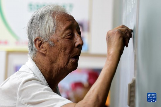 7月21日,叶连平在“留守未成年人之家”教室里为英语课准备板书。