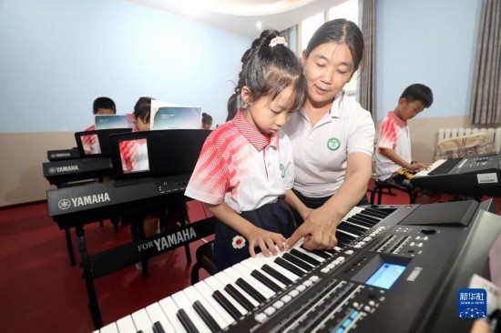 7月25日,在河北省石家庄市鹿泉区青少年校外活动中心,老师指导学生练习电子琴。