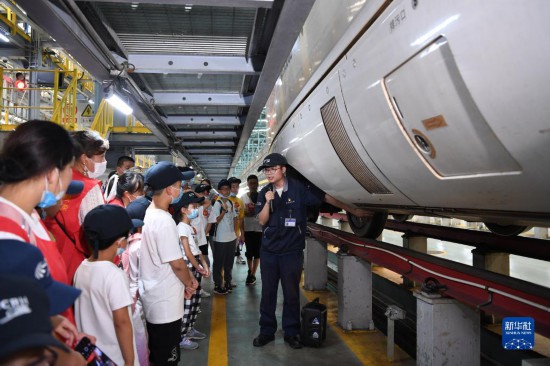 7月27日,合肥南动车运用所技术人员向小朋友介绍动车运维流程。