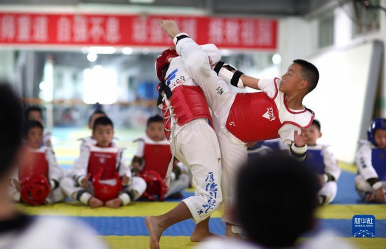 8月3日,孩子们在贵州省黔东南苗族侗族自治州丹寨县一家跆拳道馆练习跆拳道。
