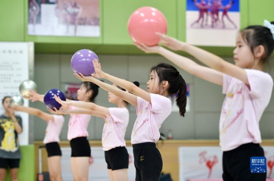 8月3日,在河北省石家庄市裕华区的一家体育训练馆,学习艺术体操的孩子们在刻苦训练。