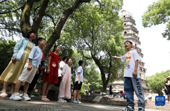8月3日,在江苏苏州虎丘景区,一名孩子在体验“小小讲解员”上岗实践。