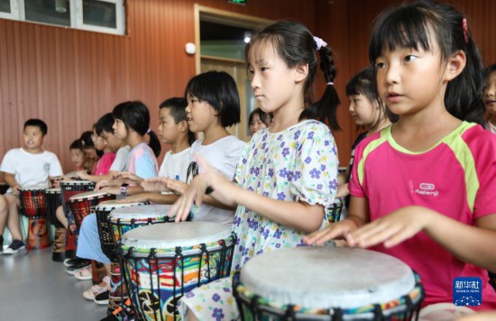 8月4日,在辽宁省沈阳市浑南区第九小学,参加暑期托管班的学生学习非洲鼓。