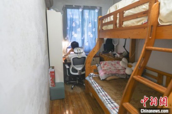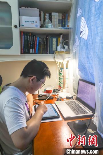 8月5日,刘熙鸿在家中狭窄的房间内学习。 刘力鑫 摄