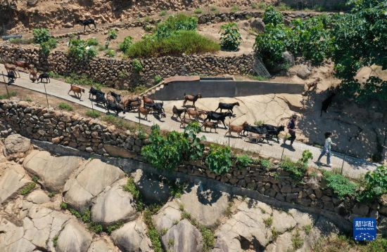 8月5日,汪淇(前)和父亲行走在山羊养殖场的路上(无人机照片)。