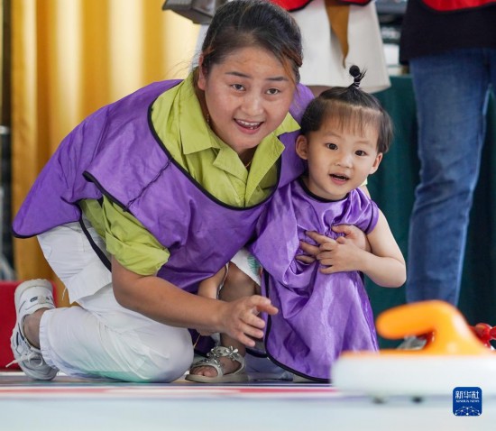 小朋友和家人一起参加“陆地冰壶”比赛(8月6日摄)。