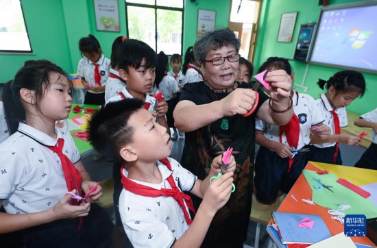 8月10日,湖州市吴兴实验小学的学生在“博学课堂”上学习剪纸。 新华社记者 徐昱 摄
