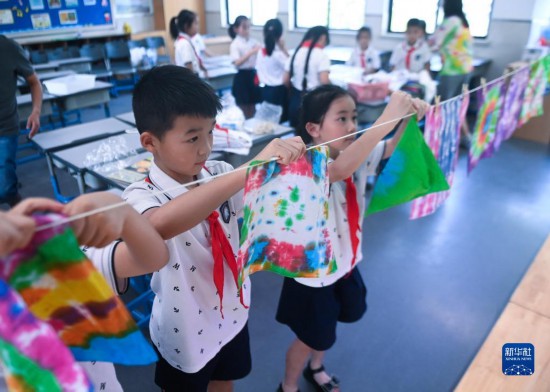 8月10日,湖州市吴兴实验小学的学生把做好的扎染作品挂在教室里。 新华社记者 徐昱 摄
