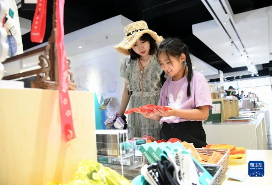 8月11日,一位小朋友和家长在陕西历史博物馆文创商店挑选文创类商品。