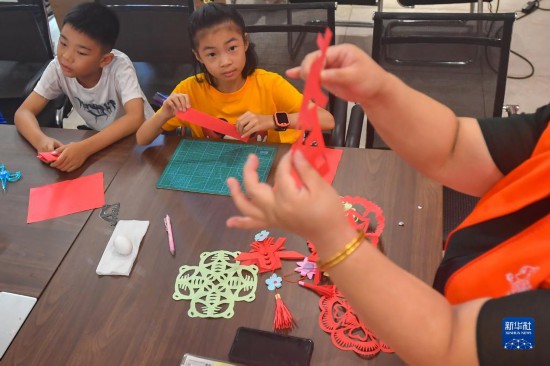8月17日,在湘潭市雨湖区窑湾街道唐兴寺社区,小朋友在听志愿者讲解剪纸的技巧。