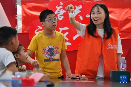 8月17日,在湘潭市雨湖区窑湾街道唐兴寺社区,小朋友在观看志愿者演示“浮起来的鸡蛋”科学小实验。