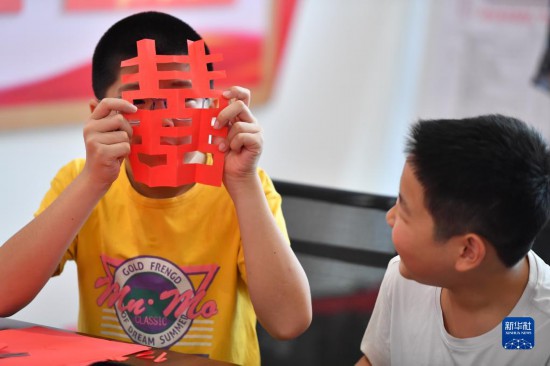 8月17日,在湘潭市雨湖区窑湾街道唐兴寺社区,小朋友在展示自己的剪纸作品。