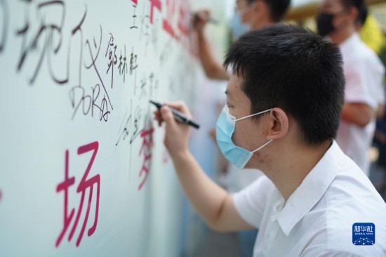 在位于南昌的江科附中高中部毕业典礼上,刘熙鸿在签名墙签名(8月13日摄)。