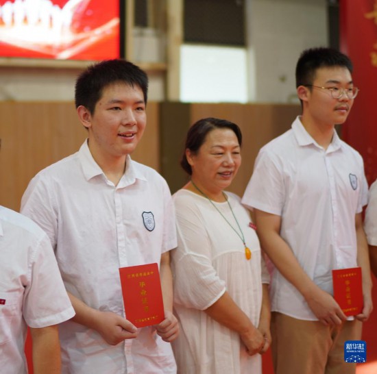 在位于南昌的江科附中高中部毕业典礼上,刘熙鸿(左)上台领取毕业证书(8月13日摄)。