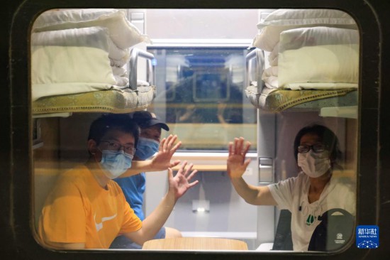 在南昌火车站,刘熙鸿和家人在前往北京的火车上向窗外挥手告别(8月15日摄)。
