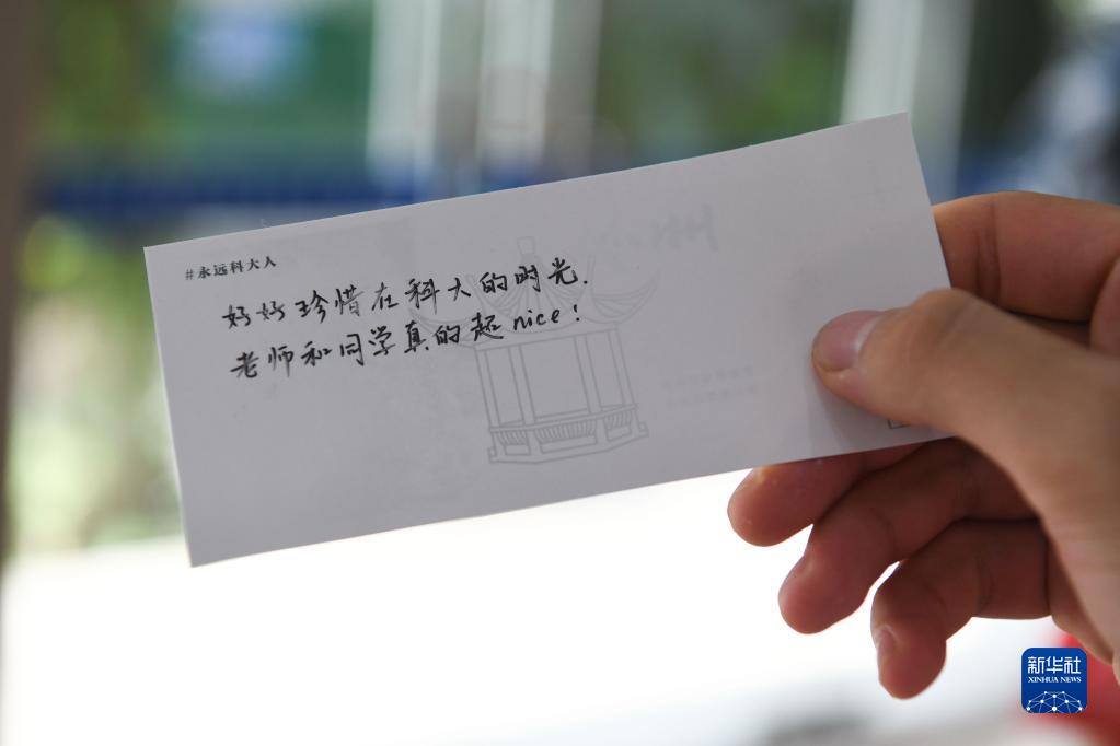 8月21日,一名2022级本科新生领取了写有2022届毕业生祝福的明信片。新华社记者 张端 摄