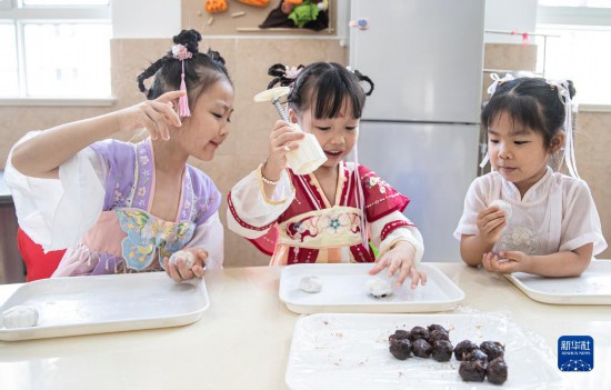 9月8日,浙江省慈溪市阳光幼儿园(北园)的孩子们在制作冰皮月饼。