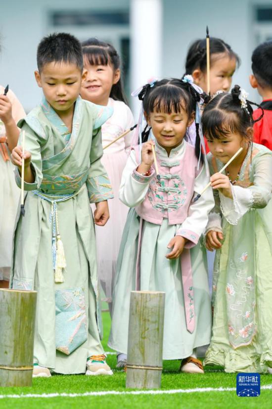9月8日,浙江省湖州市长兴县煤山镇中心幼儿园的小朋友在体验投壶游戏。
