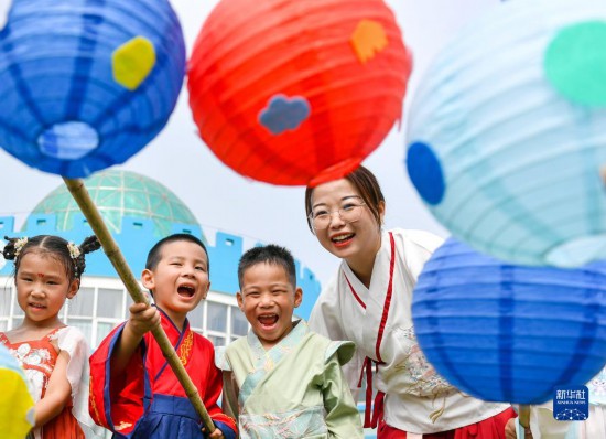 9月8日,浙江省湖州市长兴县煤山镇中心幼儿园的师生一起进行竹竿挑灯游戏。