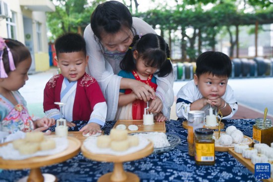 9月8日,长桥中心幼儿园的孩子们在老师的带领下自制桂花月饼。