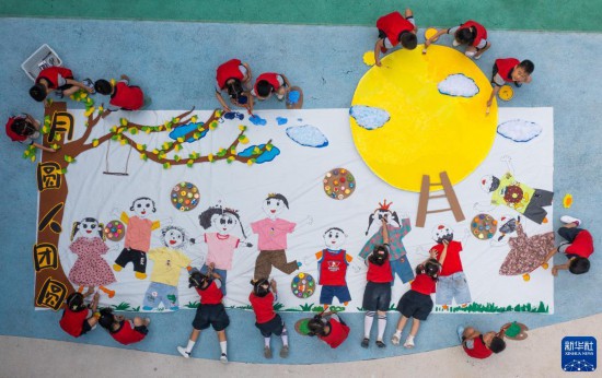 9月8日,长桥中心幼儿园的孩子们在老师的带领下用废旧衣物等创作“月圆人团圆”环保创意画(无人机照片)。