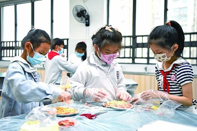 长沙市东郡第二小学学生在烘焙课上练习。新华社发
